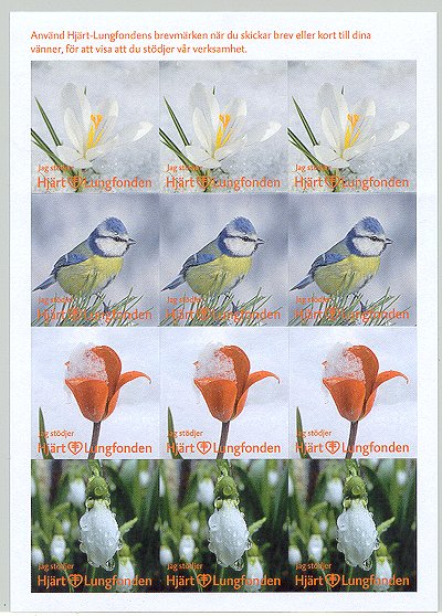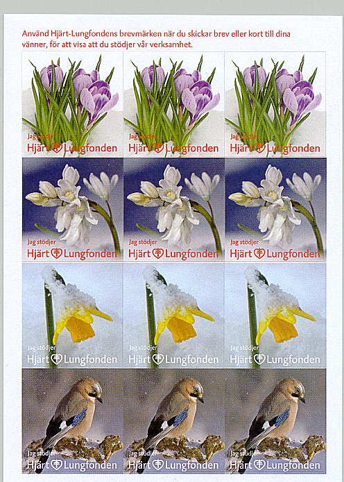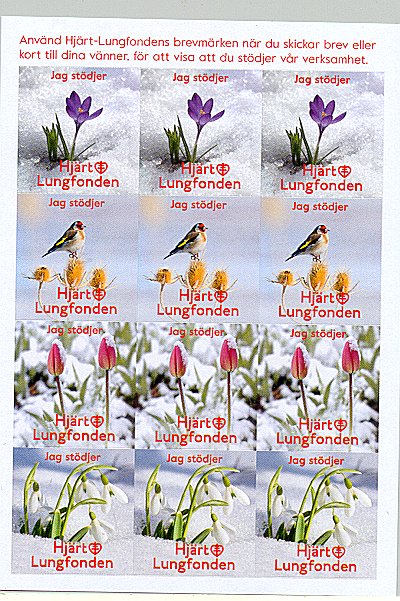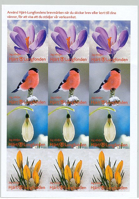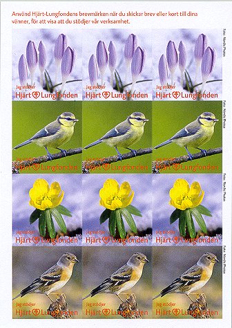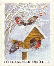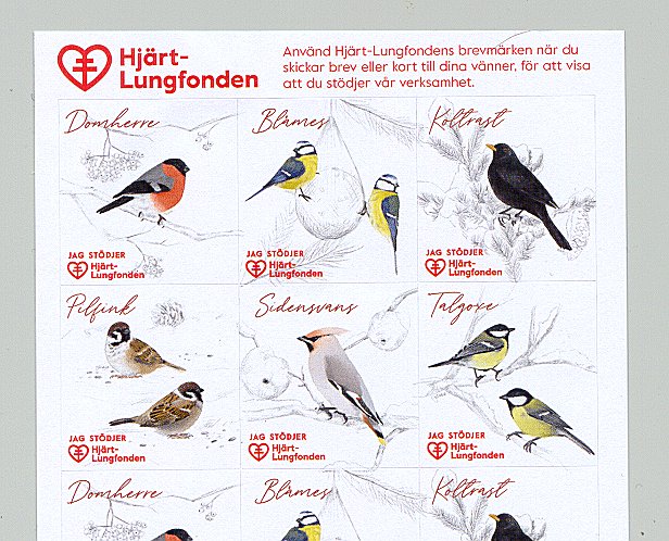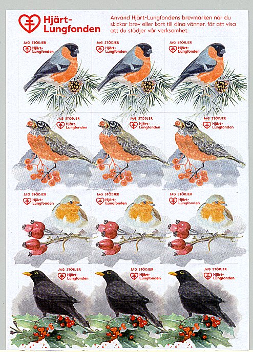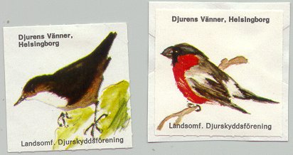 - Fåglar. Karta om 12 märken. Flera tryckupplagor. År: ? Konstnär: ? Storlek: 45 x 45 mm. Arkets storlek: 2 x 12 märken. Finns även i storleken 35 x 35 mm. Ingående fåglar: Stare, gulsparv, bofink, gärdsmyg, nötskrika, sädesärla, blåmes. taltrast, nötväcka, gröngöling, domherre, ladusvala.