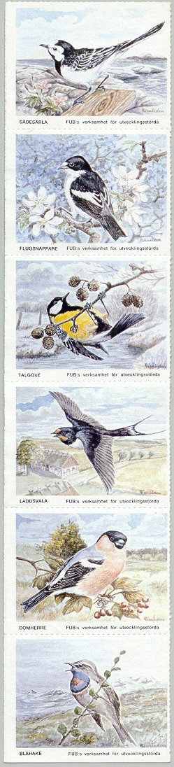 - Fåglar. Strip om 6 märken. År: ? Konstnär: Rune Wenliden.. Storlek: 45 x 35 mm. I kartor om 6 x 4 märken. Ingående fåglar: Sädesärla, flugsnappare, talgoxe, ladusvala, domherre, blåhake.