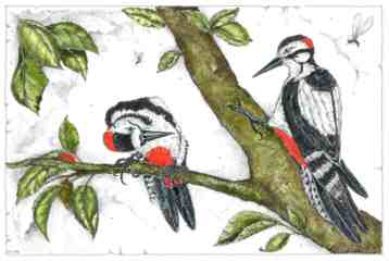 - Rødovre Apotek. [Musvit (Parus major)] - [Stor flagspaette (Dendrocopos major)] - [Rødhals (Erithacus rubecula)]. Foto: Robert Trojaborg.
