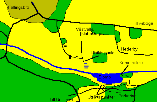 Västvalla. Hit kommer du om du åker Arbogavägen ut ur samhället. Strax efter folkhögskolan ser du en skylt som pekar till höger som det står Västvalla på. Tag denna väg och åk tills den tar slut. Den slutar vid en stor vit gård. Gården är Västvalla. Åk genom gården tills vägen tar slut. Vägen slutar på en liten kulle vid ett gult hus. Huset var tidigare Frövi fågelklubbs klubbstuga. Härifrån har du en fin utsikt över området. Du kan även fortsätta stigen och komma ned till Arbogaån.