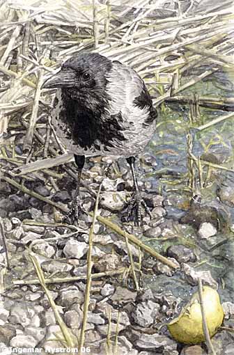 Nytt vykort "Kråka med äpple 1, Akvarell. Formar 100 x 150 mm.