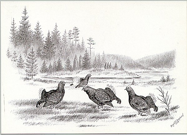 - Leif Liljeblad. "Spelande orrar." 186x124 mm. [1990]