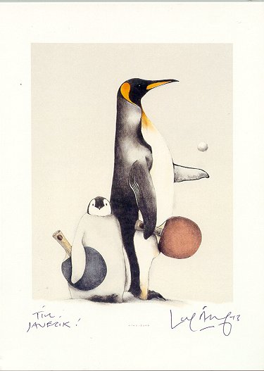 - " PING PONG". Kungspingvin och hakremspingvin. Åbergs Museum, Bålsta. 130 x 180 mm.