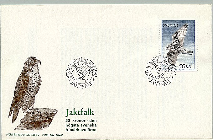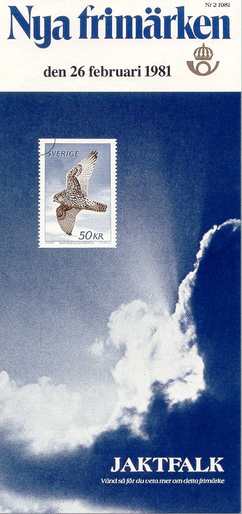 - 26.2.1981. 50 KR Jaktfalk. Tryckta i häften/ Printed in booklets (1x4). - [FDC] - [Fåglar på frimärken, mapp PFA] - [Info-blad, PFA] - [Tändsticksask, Postmuseum]