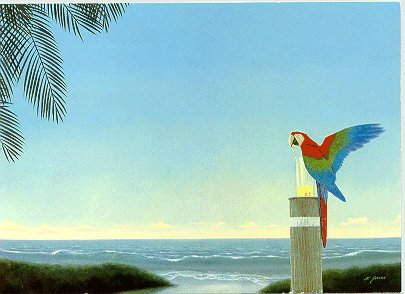 - Grönvingad ara. "Belo Horisente". 130 x 160 mm. Vern. kort "Fantastiske figurationer" Galerie Knud Grothe, Charlottenlund. [1999]