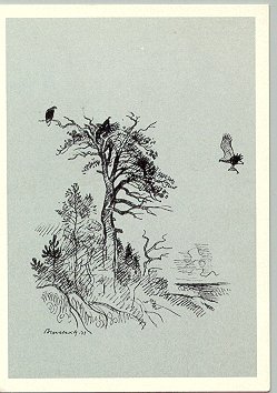 - Sten Regnell. "Havsörn och kråkor." 148x110 mm. Sv/v.
