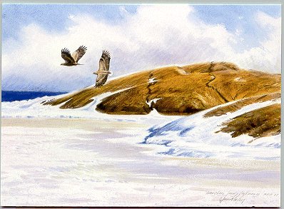 - Dag Peterson. "Vitkindade gäss över Magdalenafjorden." 208x100 mm. [1996]