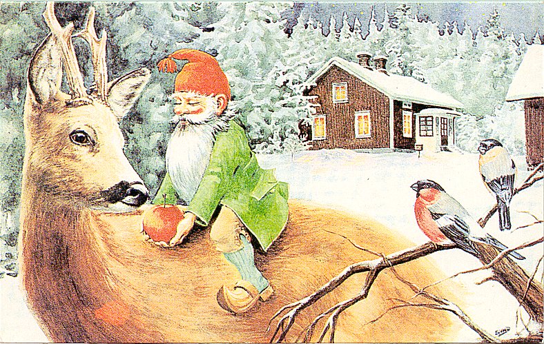 - Leif Liljeblad. Tomte och sparvuggla. Dubbelt. 170 x 115 mm.